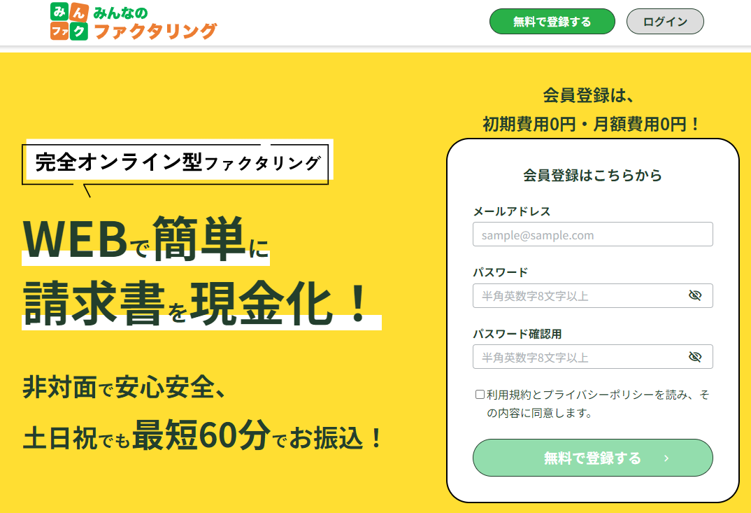 みんなのファクタリングは非対面・完全オンライン完結のファクタリングサービスです。